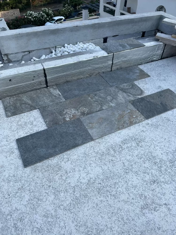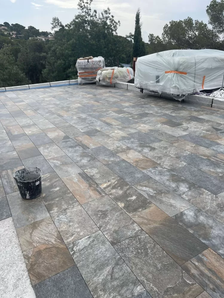 Pose d’un carrelage Bali, sur toit terrasse, après la pose d’une étanchéité optimale.